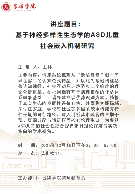 《基于神经多样性生态学的ASD儿童社会嵌入机制研究》主题讲座预告