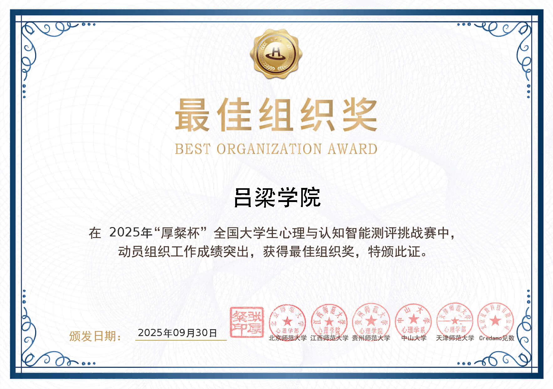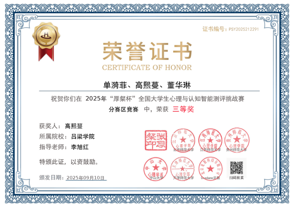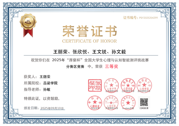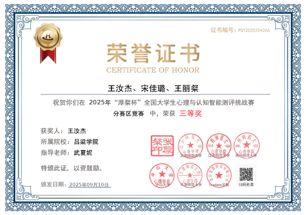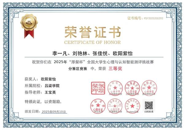 10月11日,首届“厚粲杯”全国大学生心理与认知智能测评挑战赛全国总决赛圆满落幕。我系应用心理学专业组建的8支队伍参赛,历经数月备战与激烈角逐,最终4支队伍凭借出色的专业素养和创新能力,荣获北部赛区三等奖,我校因出色的组织工作被大赛授予“最佳组织奖”,充分展现了心理学类专业在竞赛中的扎实积累与持续进步。