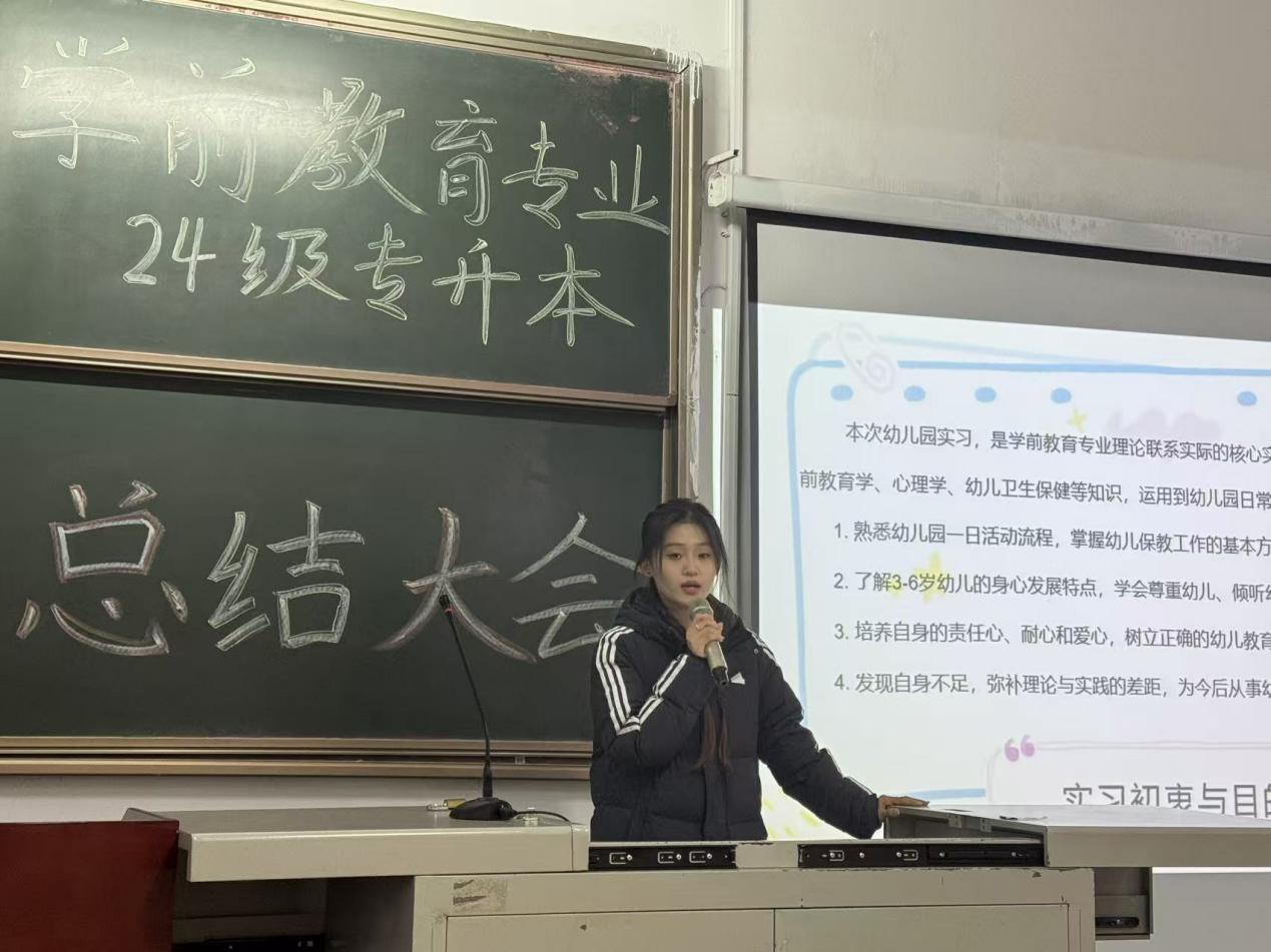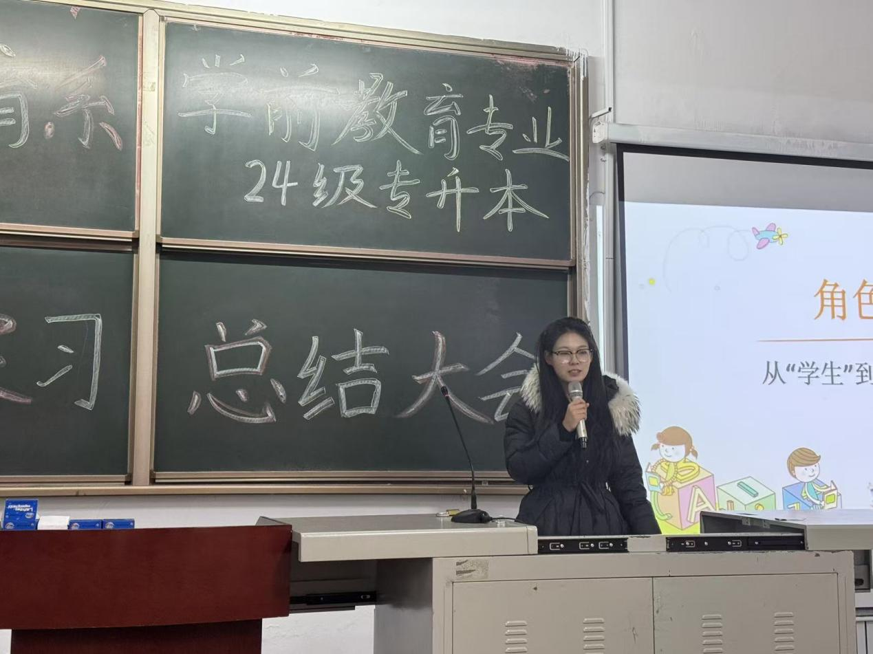 学前专业教研室主任高小丽对实习工作进行了总结,强调大会既是对四个月实习的回顾,更是同学们职业生涯的新起点,指出经过实践淬炼,学子已初步具备“心中有爱、眼中有光、手中有法”的专业特质,为成为优秀幼儿教师奠定坚实基础。