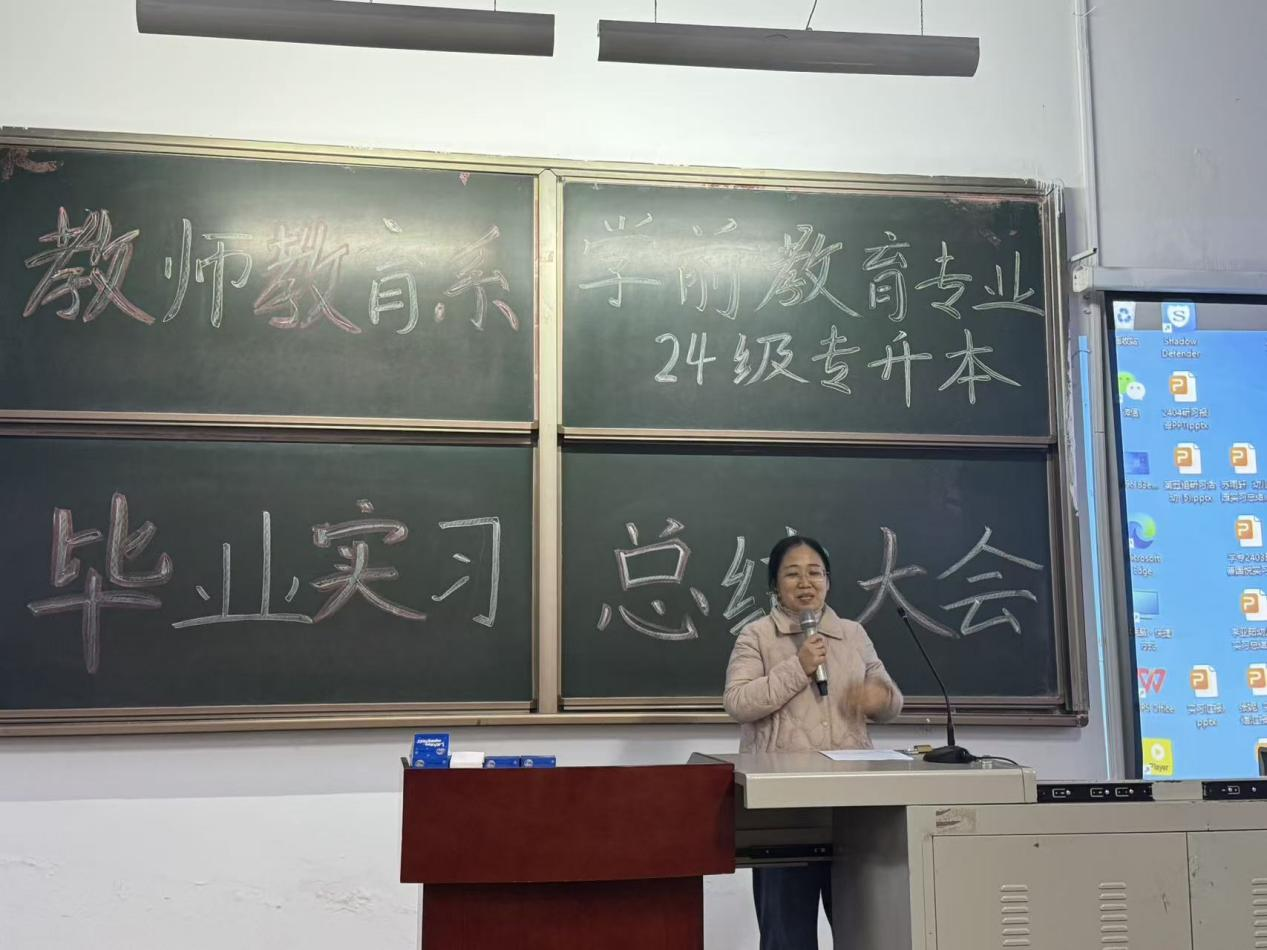 1月7日,学前教育专业专升本毕业实习总结大会在1C101举行,系领导班子成员及全体实习指导教师参加。武春霞主持会议。