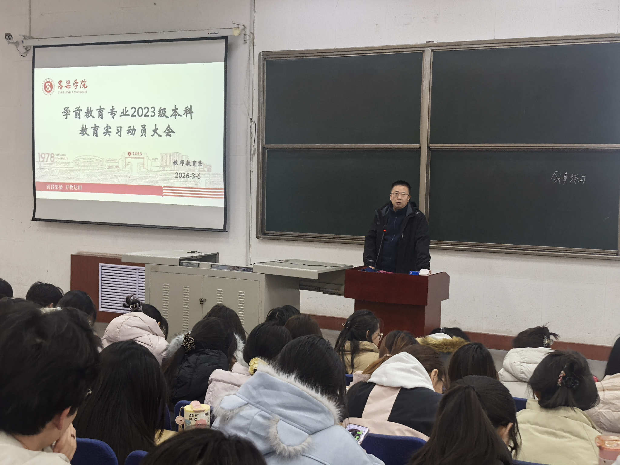 系主任赵冲发表动员讲话。他立足教育实习的重要意义与核心要求,强调实习是理论与实践深度融合的关键环节,是锤炼专业技能、践行教育初心的重要途径。他勉励全体同学要珍惜宝贵的实习机会,以饱满的热情和严谨的态度投入到实习工作中,在实践中深化对专业知识的理解,提升保教实践能力,为未来成为合格的学前教育工作者奠定坚实基础。