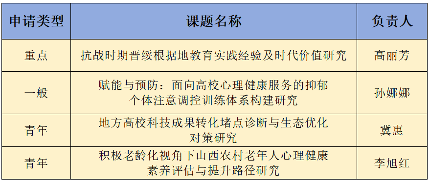 近日,2025年度山西省哲学社会科学规划课题拟立项名单正式公布,我系高丽芳、孙娜娜、冀惠、李旭红四位教师表现亮眼,共有4项课题成功入选拟立项名单,涵盖重点、一般、青年三类项目。