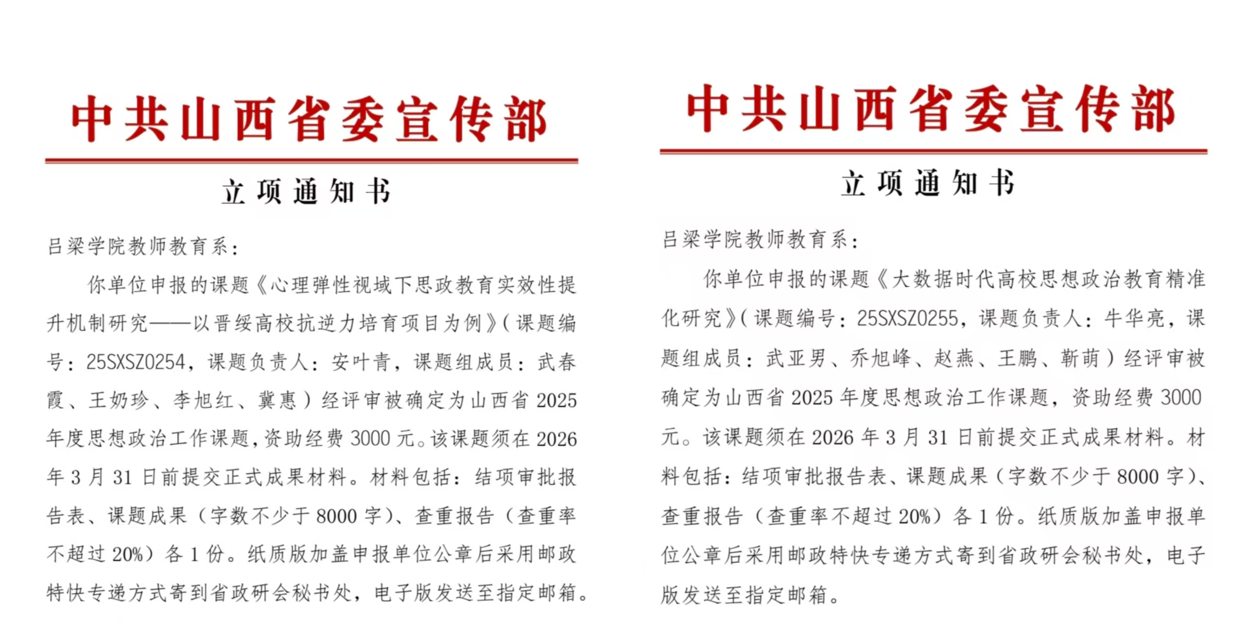 近日,我系科研工作喜获佳绩!由牛华亮老师主持的课题《大数据时代高校思想政治教育精准化研究》(课题编号:25SXSZ0255)和安叶青老师主持的课题《心理弹性视域下思政教育实效性提升机制研究——以晋绥高校抗逆力培育项目为例》(课题编号:25SXSZ0254),经严格评审,双双被确定为山西省2025年度思想政治工作课题,这标志着系部在思政教育研究领域取得重要突破。